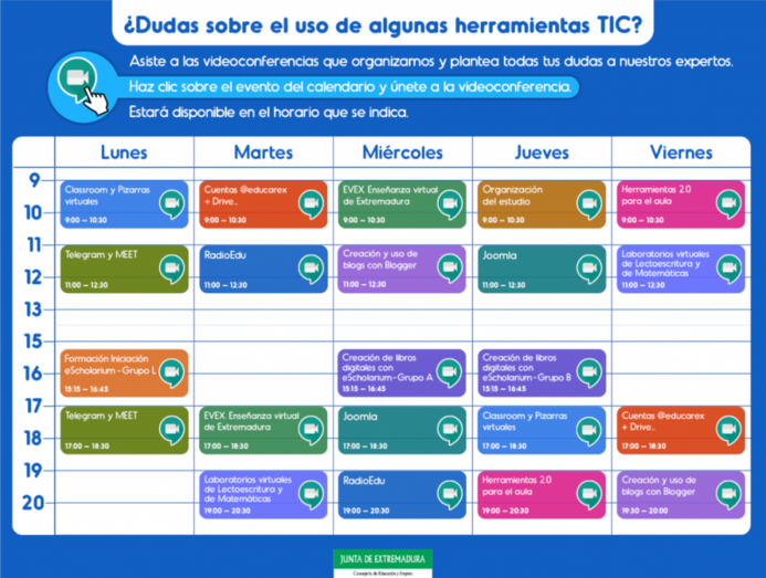 La actividad más reciente, que se ha puesto en marcha esta misma semana, consiste en una serie de videoconferencias en las que los docentes interesados pueden inscribirse desde una página del portal educativo Educarex https://www.educarex.es/info-coronavirus/atencion-online.html, de acuerdo con un calendario semanal.