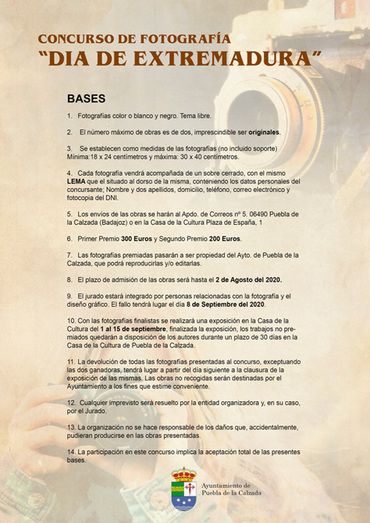 La Concejalía de Cultura del Ayuntamiento de Puebla de la Calzada convoca el XXIII Concurso de Fotografías “Día de Extremadura” a través de las siguientes bases: Fotografías color o blanco y negro. Tema libre. El número máximo de obras es de dos, imprescindible ser originales. Se establecen como medidas de las fotografías (no incluido soporte) Mínima: 18 x 24 centímetros y máxima: 30 x 40 centímetros.