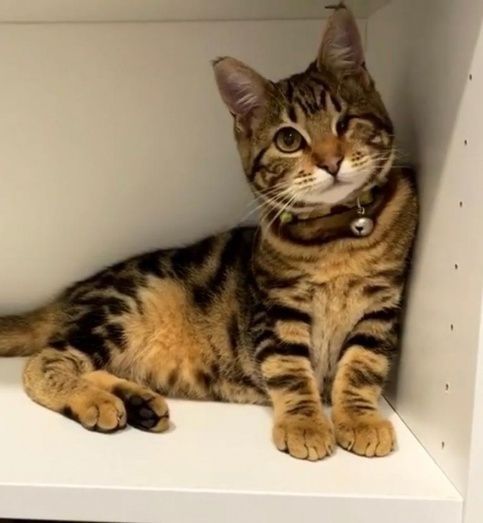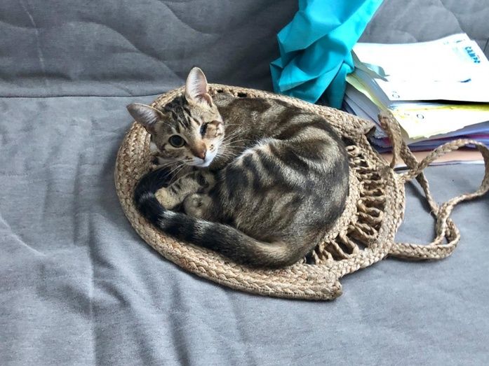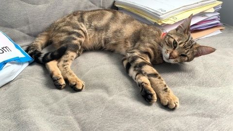 Se llama Verbena, tiene un año, es pequeña de tamaño, tiene un collar rojo con un cascabel. Tiene el ojo cerrado con puntos recientes y tiene también una cicatriz en el abdomen porque ha sido esterilizada hace 10 días.
