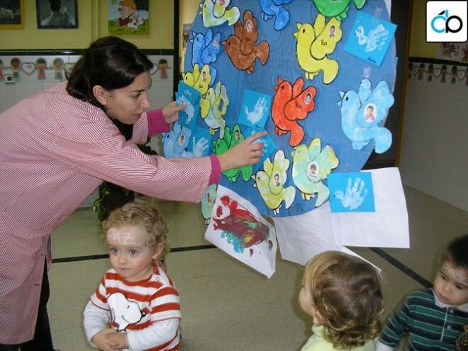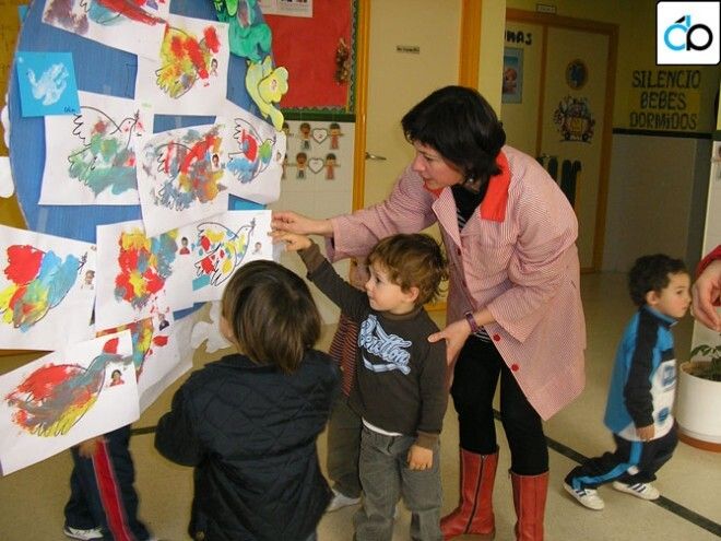 Durante toda la semana realizaron actividades por aula. Los grupos de 2-3 años decoraron palomas con llamativos colores y estamparon besos sobre un corazón que unía las manos de niños de diferentes razas. Estos corazones fueron colocados en forma de cadeneta en la entrada del Centro. Los de 1-2 años estamparon sus manitas pintadas de blanco sobre cartulina azul, que serían transformadas por sus educadoras en palomas. Los bebés (de 0-1 años) con ayuda de sus educadoras pegaron su fotografía sobre una paloma que después colorearon con pintura de dedos.
