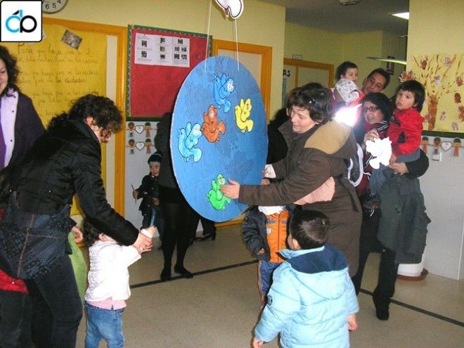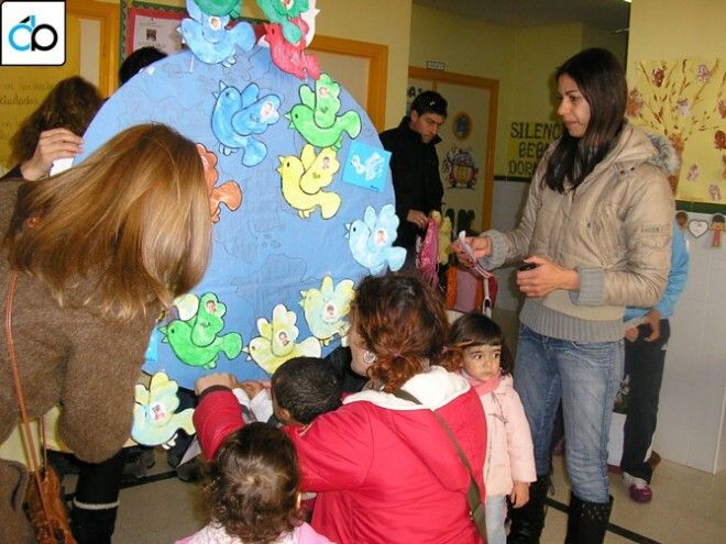 El viernes todas las clases decoraron el recibidor del Centro con los trabajos realizados durante toda la semana. También expusieron murales con bonitas frases y poesías alusivas a la Paz.; y como broche final, a la hora de la salida, todos juntos: padres, madres, abuelas, abuelos y personal educativo pegaron las palomas con las fotografías de los niños sobre un gran círculo que representaba al mundo, deseando la Paz para todos.