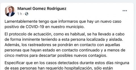 El alcalde de Montijo, Manuel Gómez, ha informado a través de redes sociales de un nuevo caso positivo por coronavirus en el municipio.