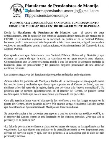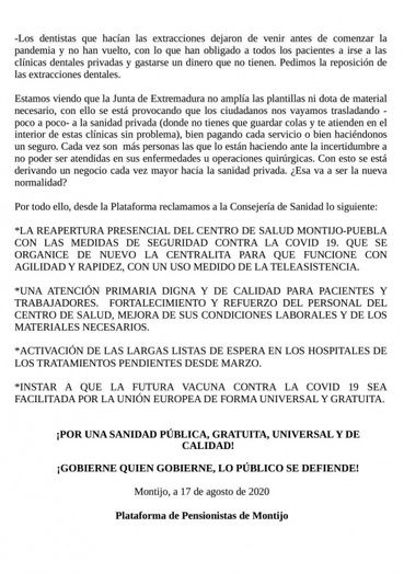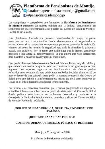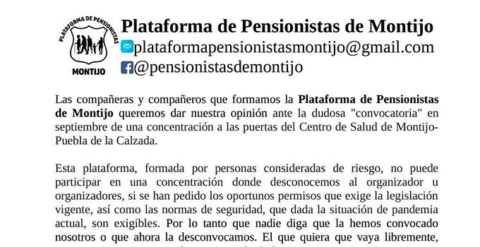 "Las compañeras y compañeros que formamos la Plataforma de Pensionistas de Montijo queremos dar nuestra opinión ante la dudosa "convocatoria" en septiembre de una concentración a las puertas del Centro de Salud de Montijo-Puebla de la Calzada.