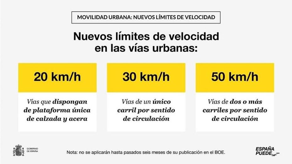 Las modificaciones relativas al Reglamento de Circulación y Vehículos entrarán en vigor el 2 de enero de 2021. No obstante, la modificación del artículo 50 del Reglamento General de Circulación (velocidades en zonas urbanas) entrará en vigor a los seis meses de su publicación en el Boletín Oficial del Estado para que los ciudadanos los conozcan de forma adecuada y para que las administraciones públicas dispongan de un plazo suficiente para adaptar la señalización.