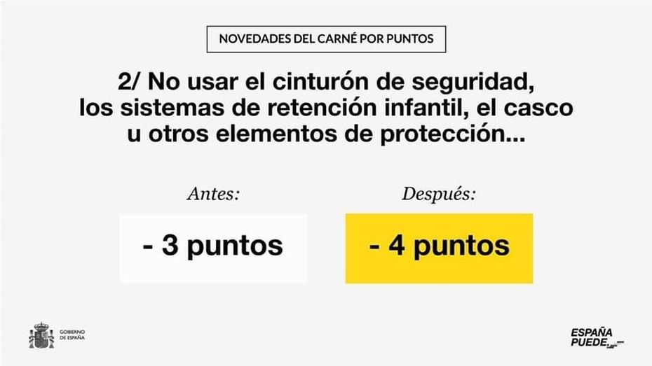 Eleva de tres a cuatro los puntos que se detraen por no utilizar el cinturón de seguridad, los sistemas de retención infantil, el casco y otros elementos de protección. Además, incorpora explícitamente como causa de sanción el mal uso de estos elementos (por ejemplo, llevar el casco de protección o el cinturón de seguridad sin abrochar) porque las consecuencias negativas para la seguridad del conductor son las mismas.