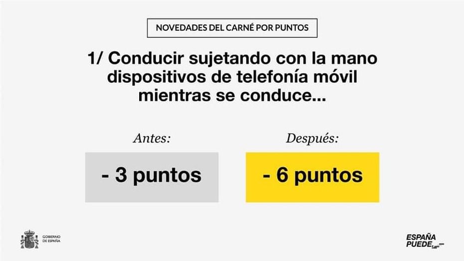 · Aumenta de 3 a 6 los puntos a detraer por conducir sujetando con la mano dispositivos de telefonía móvil.