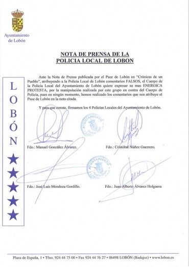 "Ante la Nota de Prensa publicada por el PSOE de Lobón en 'Crónicas de un Pueblo', atribuyendo a la Policía Local de Lobón comentarios FALSOS, el Cuerpo de la Policía Local del Ayuntamiento de Lobón quiere expresar su más ENÉRGICA PROTESTA, por la manipulación realizada por este grupo en contra del Cuerpo de Policía, pues en ningún momento hemos realizado los comentarios que nos atribuye el PSOE de Lobón en la nota citada".