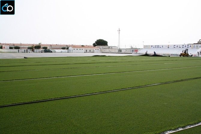 Han comenzado a colocar la moqueta de césped artificial en el campo de fútbol