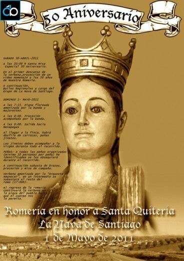 La Nava de Santiago celebra este año la 50 Romería en honor de su patrona, Santa Quiteria. Los actos comenzaran el sábado 30 de abril a las 20:00 horas con la celebración de una Eucaristía, a la que seguirá una verbena, en la que en uno de los descansos se proyectará un documental-homenaje a estos 50 años de la Romería. Asimismo actuará el grupo de bailes regionales de la localidad.