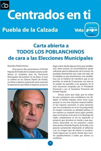 El PP de Puebla de la Calzada ha publicado un Boletín Informativo especial de cara a las elecciones del 22 de mayo en el que incluye una Carta Abierta a los poblanchinos, unas “reflexiones electorales”, aborda el tema del proyecto de la Residencia Geriátrica, el “escándalo laboral por discriminación política” y avanza su Programa Electoral.