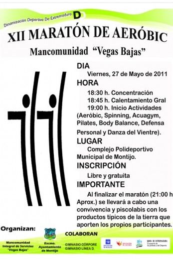El Ayuntamiento de Montijo y la Mancomunidad I.S. Vegas Bajas  organiza la XII  Maratón de Aeróbic de las Vegas Bajas. Colaboran en el evento la Diputación de Badajoz, la Diputación de Cáceres, la Consejería de los Jóvenes y del Deporte de la Junta de Extremadura y los gimnasios Córpore y Línea D, ambos de Montijo.