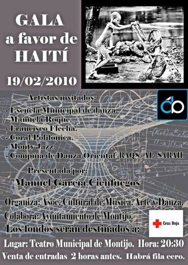 El Teatro Municipal de Montijo acogerá el viernes 19 de febrero, a las 20:30 horas, una Gala Solidaria a favor de Cruz Roja para los damnificados del terremoto de Haití. Gala que cuenta con la colaboración del Ayuntamiento de Montijo.