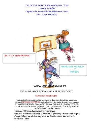 La Asociación de Baloncesto de Lobón, ha organizado la décima edición de las 24 Horas de Baloncesto que se jugarán el 20 de agosto, a partir de las 18:00 h. en el Pabellón del Colegio.