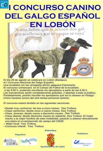 I Concurso Canino del Galgo Español en Lobón el 28 de agosto en el campo de Fútbol de Lobón a las 09:00 h. pudiendo inscribirse los ejemplares a partir de las 08:00 h.