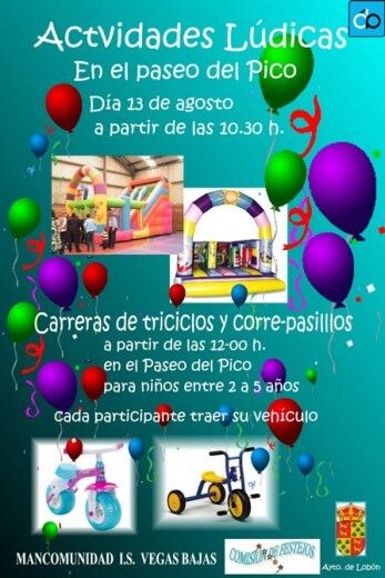 El Ayuntamiento de Lobón ha organizado una Jornada Lúdica, el sábado 13 de agosto a partir de las 10:00 h. en el Paseo del Pico, para niños de 2 a 5 años en la que habrá Carreras de Triciclos y Corre-Pasillos, desde las 12:00 h.
