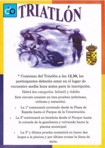 El 26 de Agosto en se desarrollará un Triatlón, a las 12:30 h. Una actividad poco común en la comarca. Los participantes deberán estar media hora antes de la prueba, en el lugar de encuentro, Plaza de España.