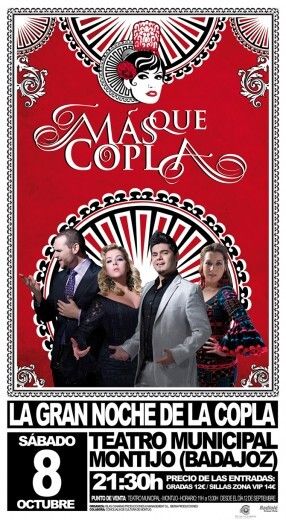 MAS QUE COPLA estará en directo hoy, 8 de Octubre, en el Teatro Municipal de MONTIJO, a las 21:30 h. con las cuatro grandes voces de los Jóvenes de la Copla, finalistas del Programa SE LLAMA COPLA, de Canal Sur Televisión. GLORIA ROMERO, INMACULADA DEL RIO, JUAN CARLOS MATA Y ALVARO LOPEZ.