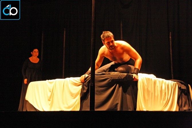 Edipo, representado por Chico García, y Yocasta, por la actriz Pilar Jiménez, dan vida a unos atormentados personajes que envuelven de tinieblas toda la escena. Dos magistrales interpretaciones que pudieron disfrutarse, el pasado sábado 22 de octubre, sobre el escenario de la Casa de la Cultura de Puebla de la Calzada, en un montaje teatral impresionante desde su inicio a su desenlace.