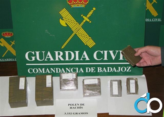 Operación transfronteriza llevada a cabo este pasado mes de marzo, onde la Guardia Civil detuvo en Badajoz a un ciudadano portugués, a quien se le intervino en el vehiculo que conducía una bolsa con mas de 3 kilos de polen de hachis que ocultaba debajo del asiento del acompañante,  con 6 tabletas de polen de hachis.