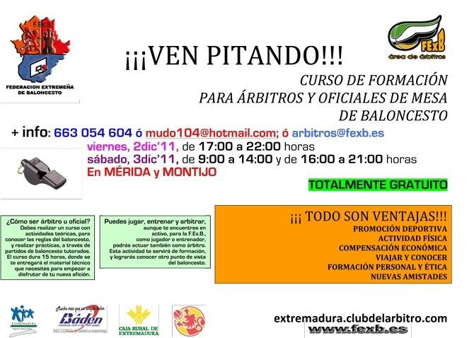 La Federación Extremeña de Baloncesto ofrece durante los días 2 y 3 de diciembre, en Mérida y Montijo, un Curso gratuito de Formación para Árbitros y Oficiales de Mesa de Baloncesto.