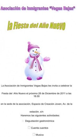 La Asociación de Inmigrantes Vegas Bajas celebra el miércoles día 28 de diciembre en su sede situada en las instalaciones del Espacio para la Creación Joven de Montijo (Avenida de la Estación s/n) su fiesta de Año Nuevo.