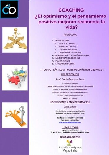 El Espacio para la Creación Joven de Montijo acoge los días 3 y 4 de enero de 2012, a partir de las 17:00 h., un curso gratuito de Coaching dirigido a todo el público interesado, impartido por la profesora Rocío Quintana Pozo, organizado por la Asociación de Inmigrantes Vegas Bajas.
