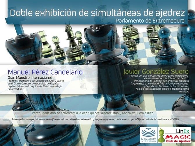 Patrocinado por el Parlamento de Extremadura, el próximo día 8 de marzo en horario de 17,00 a 20,00 horas, se celebrará una doble exhibición de simultáneas de ajedrez en el propio Parlamento, en la que por una parte, el Gran Maestro del Club Linex-Magic Extremadura Manuel Pérez Candelario, cuarto de España en la actualidad, se enfrentará a quince ajedrecistas, y por otro lado Javier González Suero, ex interno del Centro Penitenciario de Badajoz y que ahora trabaja como monitor de ajedrez para el club extremeño, se enfrentará a diez jugadores.