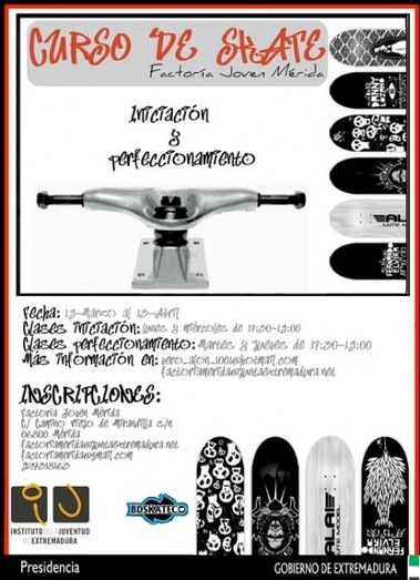 Un nuevo curso será desarrollado por el Instituto de la Juventud de Extremadura en la Factoría Joven de Mérida desde el 19 de marzo hasta el 13 de abril; se denominará Curso de Iniciación y Perfeccionamiento de Skate, modalidad urbana.