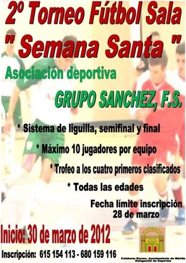 El próximo 30 de marzo tendrá lugar el II Torneo de Fútbol Sala “Semana Santa” organizado por la Asociación Deportiva Grupo Sánchez F.S. y con la colaboración del Ayuntamiento de Mérida a través de la Delegación de Deportes.