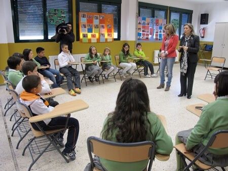 La vicepresidenta, portavoz y consejera de Empleo, Empresa e Innovación, Cristina Teniente, y la consejera de Educación y Cultura, Trinidad Nogales, visitaron el C.E.I.P. Félix Rodríguez de la Fuentede Mérida, que participa en este proyecto, para compartir una sesión con un grupo de alumnos y charlar con ellos sobre sus inquietudes y concepción del emprendimiento.