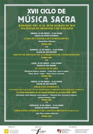 El XVII Ciclo de Música Sacra continúa con su programa de conciertos, en esta ocasión el de clausura de las II Jornadas Extremeñas de Orquesta Barroca que se han venido celebrando en el Conservatorio Superior “Bonifacio Gil” desde el pasado día 24. La cita tendrá lugar mañana martes, 27 de marzo, a las 21:00 horas, en la iglesia de San Agustín de la capital pacense.