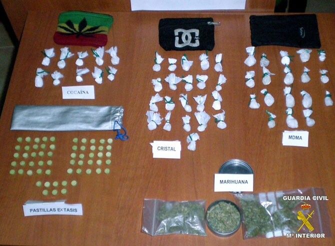 Tras la identificación de su conductor y el excesivo nerviosismo mostrado, se procedió al registro del turismo donde los agentes localizaron oculto en los huecos de las luces interiores, diferentes clases de sustancias estupefacientes ( 58 pastillas de éxtasis y 49 papelitas de cocaína y anfetaminas, además de una caja y varias bolsas de marihuana).