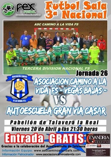 Tras la derrota del equipo en Hervás por 3 goles a 0 en un viaje muy largo, con bajas, por lesiones y problemas personales, el viernes 20 de abril a las 21:30 horas, la Asociación Camino a la Vida se enfrenta al Casar (de Cáceres) en el Pabellón de Talavera en lo que se supone un gran partido entre rivales.