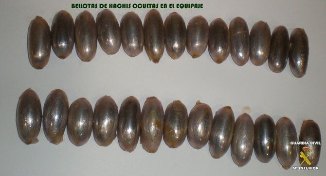 Tras la identificación y registro se le halló ocultas en el interior de su equipaje 26 bellotas de hachís.