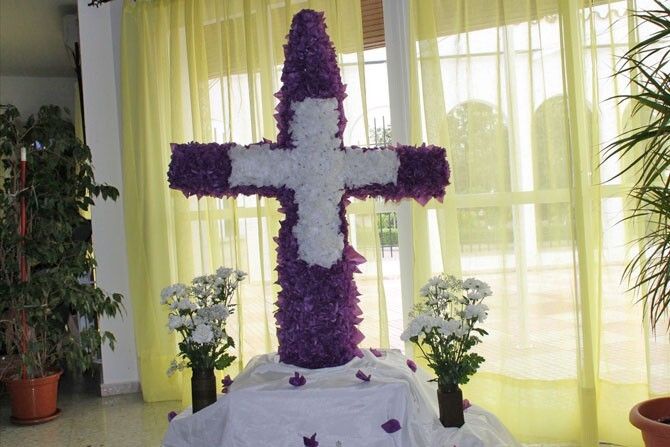La Cruz de Mayo, una costumbre que se ha implantado en el Centro de Día de la localidad, está completamente hecha con flores de papel de seda, blancas y violetas, que han estado realizando las personas mayores durante todo el mes de abril, siendo muy gratificante para ellos.