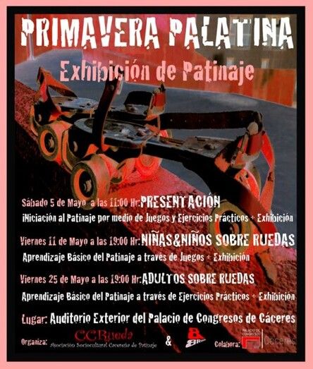 La Asociación Sociocultural Cacereña de Patinaje “CCRueda” y “8Ruedas”, en colaboración con el Palacio de Congresos de Cáceres, organizan los días 5, 11 y 25 de mayo exhibiciones y actividades de patinaje, bajo el título de “Primavera Palatina” que se llevará a cabo en el Auditorio Exterior del Palacio de Congresos de Cáceres y la entrada es gratuita.
