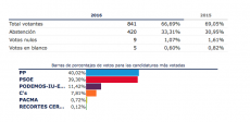 PSOE 40'2. PP 37'2. Unidos Podemos 11. PACMA 0'7.