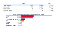 PSOE 44'6. PP 32'9. C's 10'6. Unidos Podemos 10'4. PACMA 0'5.