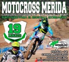 La prueba Motocross Mérida, puntuable para el Campeonato Regional de Motocross Extremeños de 2017, del domingo 19 de marzo, comenzará a las 9.30 de la mañana con los entrenamientos en las instalaciones Municipales “Vía de la Plata”. Contará con siete categorías, MX50, MX, MX85, Sub-18, MX1, MX2 y Master35.