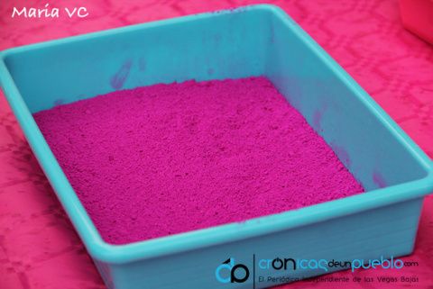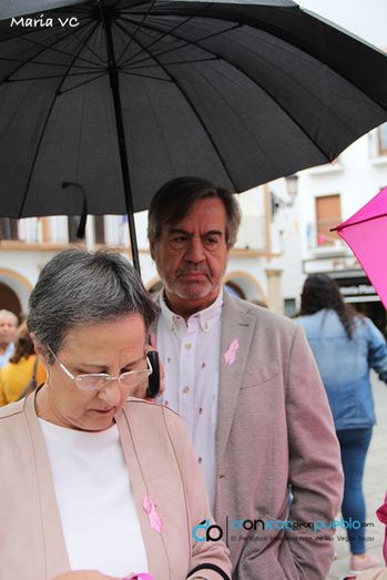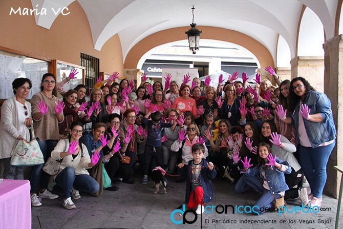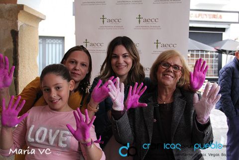 El acto se realizó en los soportales del Ayuntamiento de Montijo debido a la lluvia, y finalizó con las manos de los asistentes teñidas de rosa.