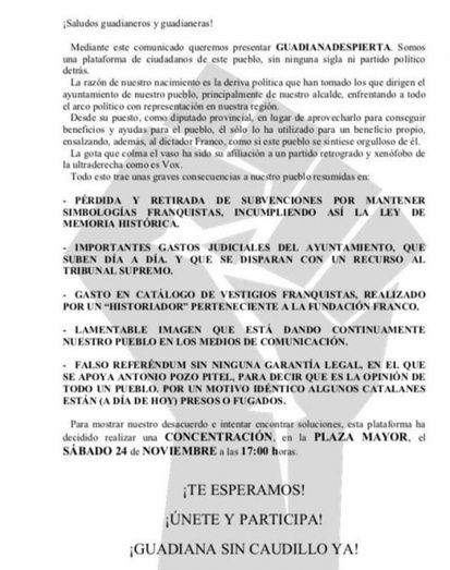 “Mediante este comunicado queremos presentar Guadiana Despierta. Somos una plataforma de ciudadanos de este pueblo, sin ninguna sigla ni partido político detrás.