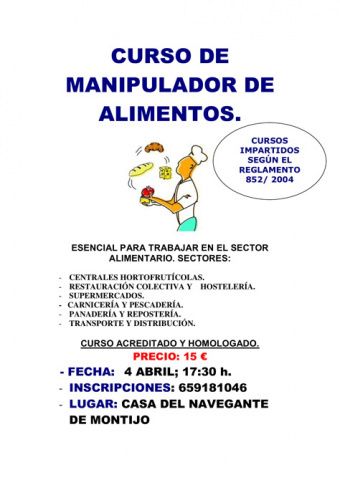 El curso teniendo un precio de 15 euros, estará homologado y acreditado, siendo esencial para trabajar en el sector alimentario como centrales hortofrutícolas, restauración colectiva, hostelería, supermercados, carnicerías, pescaderías, panadería, repostería, transporte y distribución.