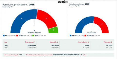 Lobón continúa siendo gobernada por el PP, que consigue mantener el total de concejales que tenía en la localidad. PSOE pierde uno, quedando 4 concejales y aparece VOX, que consigue 1 representante en el Ayuntamiento.