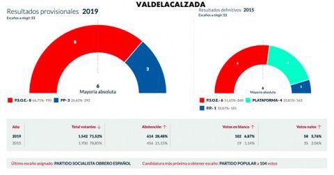En Valdelacalzada de nuevo el PSOE consigue la alcaldía, aumentando, además, el número de concejales con que contará en estos cuatro años. De los 6 que tenía en 2015 pasa a tener 8 en 2019. El PP pasa de 1 único concejal en las anteriores eleccione hasta los 3 de estos comicios. La salida de la Plataforma Vecinal Valviense ha repartido el voto entre los dos partidos que concurrían a las elecciones.