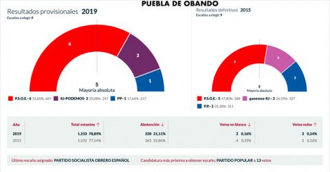 En Puebla de Obando el PSOE aumenta su mayoría y consigue cinco concejales. Tras él, con la misma representación que en las últimas elecciones, IU-Podemos con 2 concejales. El PP pierde uno de los dos concejales que tenía en la localidad y se queda sólo con 1.