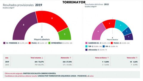 En Torremayor vuelve a estar reñida la tarta electoral. IU-Podemos mantiene sus 3 concejales, el PSOE aumenta a 3 su representación en el Ayuntamiento, y Extremeños consigue el último de los sillones posibles. Menos reparto que en las anteriores elecciones, donde cinco partidos distintos se repartieron los 7 escaños, pero habrá que buscar apoyos.