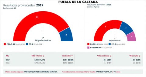 En Puebla de la Calzada llama la atención el resultado del PSOE, que aumenta su representación en el Ayuntamiento obteniendo 11 concejales frente a 2 obtenidos por el PP. IU-Podemos, que contaba con dos representantes, no obtiene suficientes votos en esta ocasión. También queda fuera Ciudadanos, que no contará con ningún concejal.