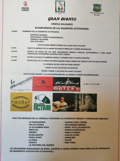 La Asociación Llama a la Puerta de la Esperanza organiza un Desfile Solidario el próximo 13 de julio, de 21:00 a 00:00 horas. El evento desfile consta de un desfile solidario de la mano de la diseñadora, Sandra Pozo y los modelos de la agencia de modelos Rubén Margallo. También habrá cante flamenco por Noelia Miralles y Curro de Badajoz a la guitarra, pintacaras y juegos tradicionales, tiro con arco, baile flamenco de la escuela de Ángel y Carmen.