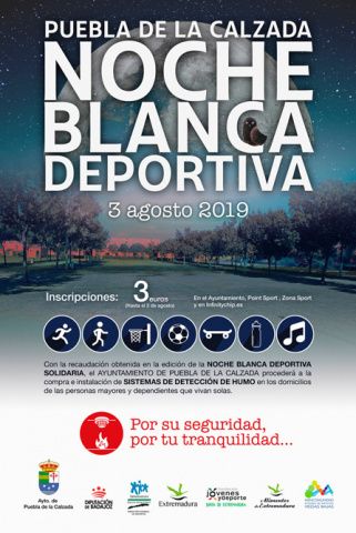 Como en ediciones anteriores, el Recinto Ferial acogerá el primer sábado de agosto la Noche Blanca Deportiva de Puebla de la Calzada, un evento familiar/saludable/solidario donde los asistentes pueden practicar diferentes modalidades deportivas gracias a la implicación de asociaciones, escuelas deportivas y agrupaciones locales –baloncesto, fútbol, cross, senderismo y skate- a la vez que disfrutan entre familiares, amigos y vecinos de una velada nocturna en convivencia, además de practicar el altruismo con la adquisición del dorsal (3 euros) siempre destinado íntegramente a una buena causa.