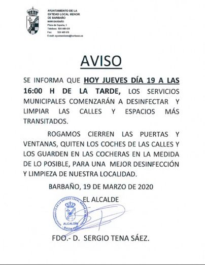 Hoy se inician los trabajos de limpieza y desinfección de las calles y parques de Barbaño, según nos informa el alcalde de la localidad, Sergio Tena.